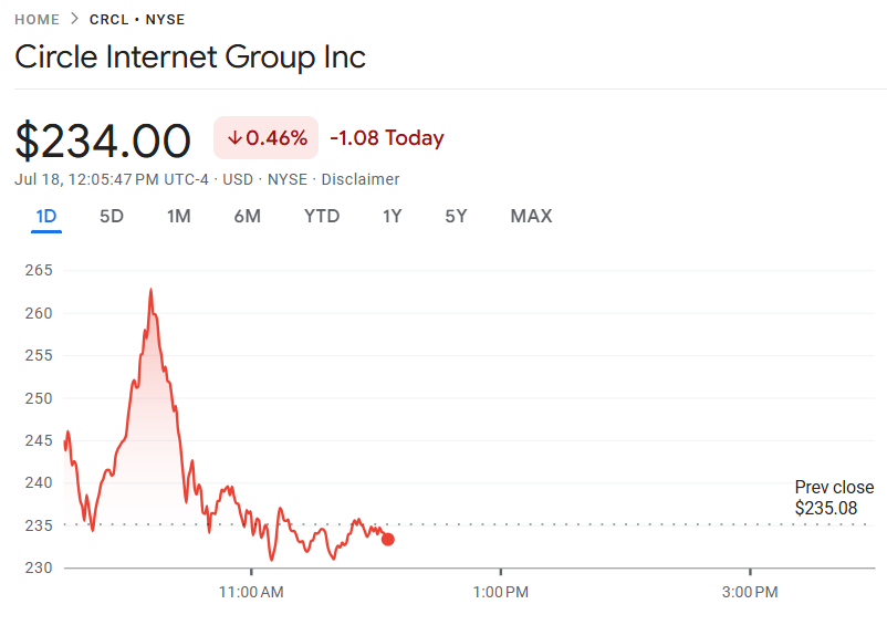Circle(CRCL)作为市值644亿美元的USDC稳定币发行方,直接受益于《GENIUS法案》构建的联邦稳定币框架。虽然法案曾因CBDC疑虑短暂受阻,CRCL股价本周仍上涨4%,现报234美元,日内振幅达7.9%。