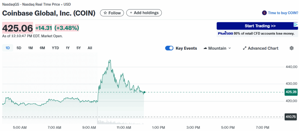 Coinbase(COIN)因《反CBDC法案》通过而获得3%涨幅,现报425美元/股。该法案明确禁止美联储直接或间接向个人发行央行数字货币,强化了私有加密货币和稳定币的市场地位。