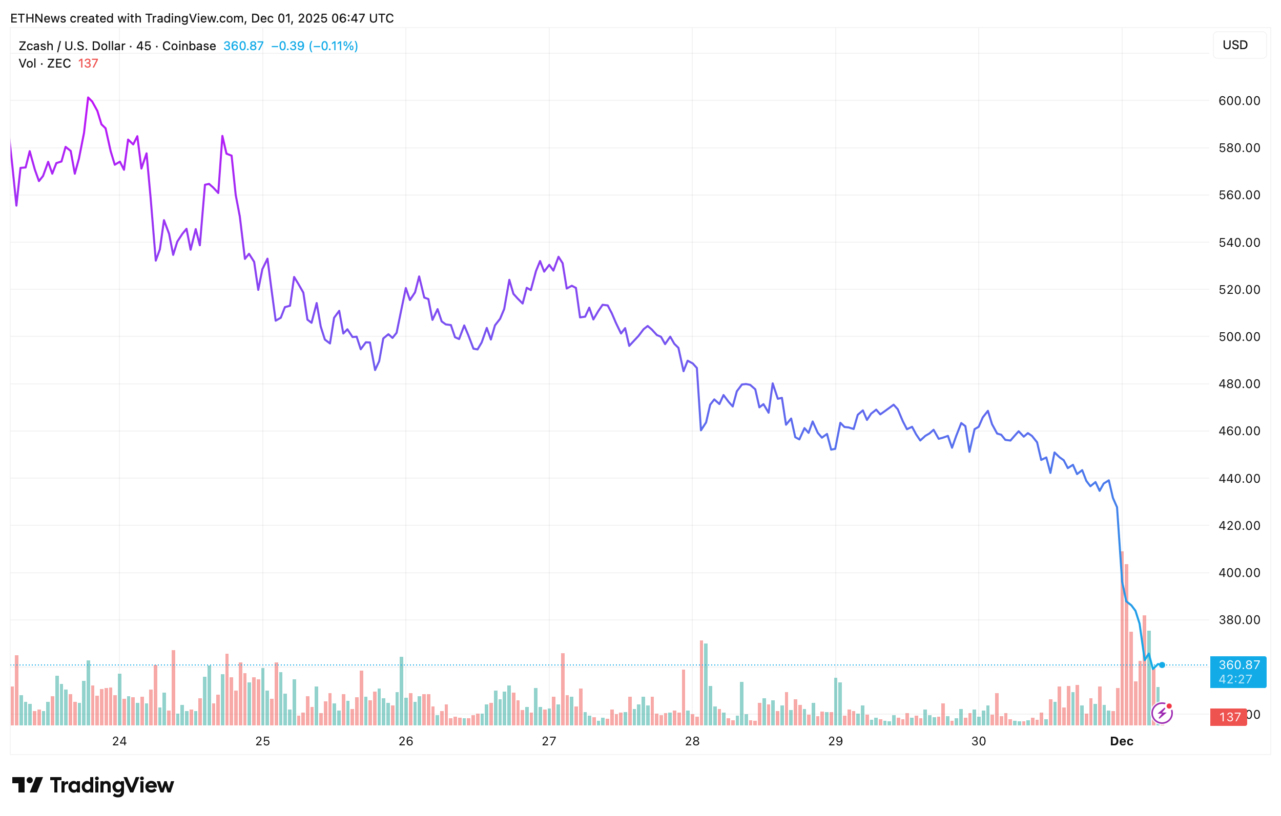 若抛压持续且市场恐慌情绪蔓延——尤其是在加密货币历来表现疲软的12月,ZEC可能继续下探至200美元中段。唯有强势收复50日移动均线并伴随情绪面转向,方能扭转当前走势。目前交易者正为更多波动做准备,密切关注Zcash能否在350美元上方企稳,或是更深跌幅已成定局。