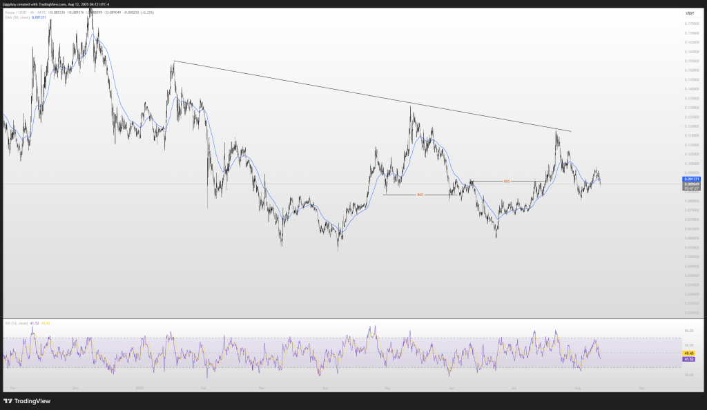 在4小时图表上,KAS价格仍受制于2024年末以来的长期下降趋势线(当前位于0.11-0.115美元区间)。尽管6月跌破0.083美元支撑后多头曾强势反弹至0.12美元,但目前已回吐部分涨幅。