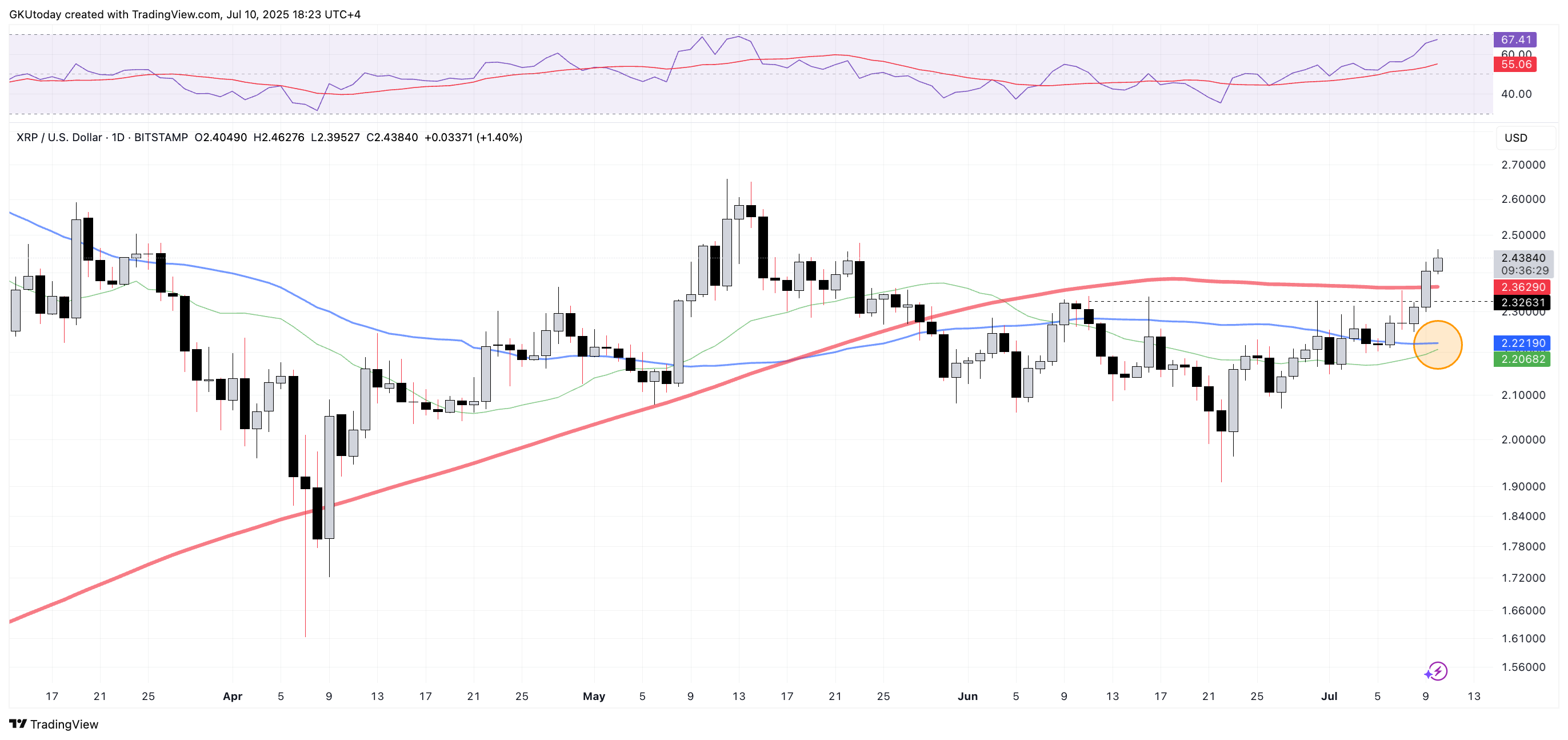 经过长时间的震荡整理,XRP价格终于强势突破2.36美元阻力区,同时站上200日均线。当前价格已稳定在2.43美元上方,最新形成的K线不仅突破了震荡区间,更是以强劲姿态彻底击穿阻力位。