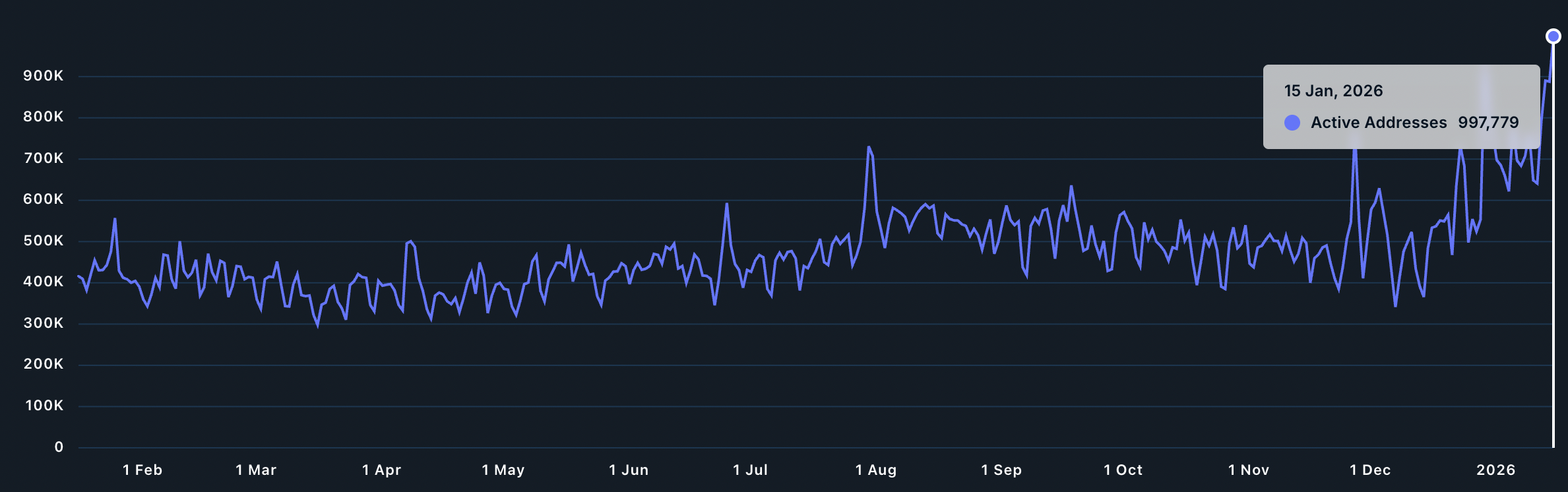 以太坊网络活动持续走强。Nansen数据显示,过去30日内活跃地址数增长53%,于1月15日达到99.5779万个,创28个月新高。