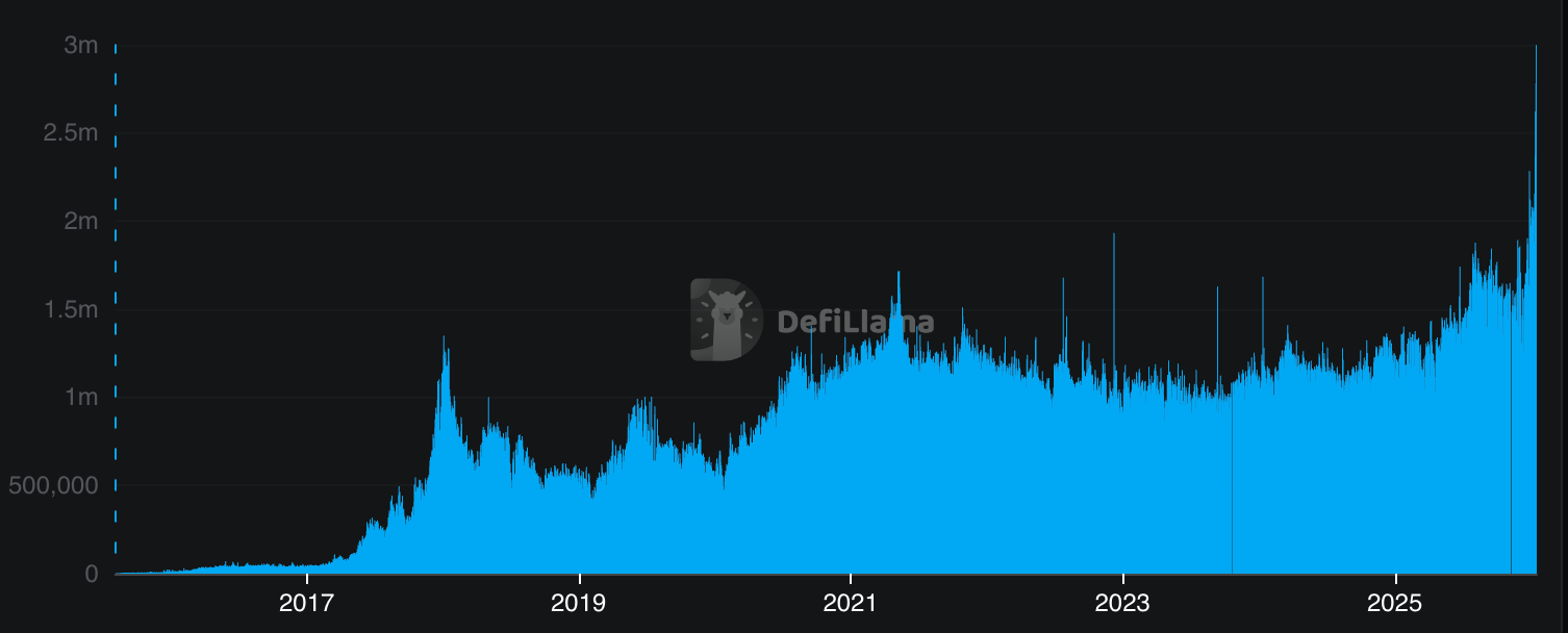 以太坊日活跃地址数上次达到此水平是在2023年9月13日,当时该指标飙升至约109万,为网络历史上第二高位,仅次于2022年12月约140万的峰值。另据DefiLlama数据,1月16日单日交易笔数亦创下290万次的历史纪录。