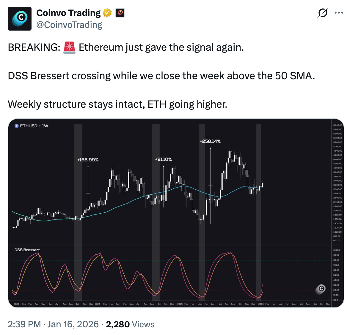 交易员Coinvo Trading指出,50周指数移动平均线位于该区间内,周线收盘需站稳该趋势线上方才能维持看涨周线结构。“周线结构保持完好,ETH将继续走高。”