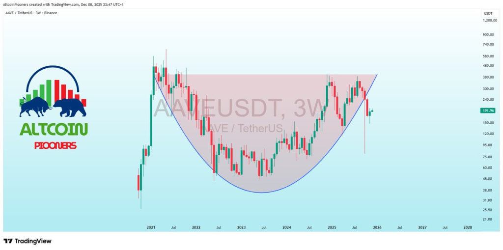 Aave代币目前徘徊在188.37美元附近,但三周走势图揭示了自2021年以来的吸筹与整理格局。加密货币分析师Altcoin Piooners分享的图表显示,该形态堪称教科书级别的杯柄形态,其潜在走势引人入胜。