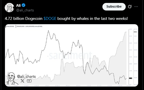 持仓量1-10亿枚DOGE的巨鲸地址在两周内增持约47亿枚代币。