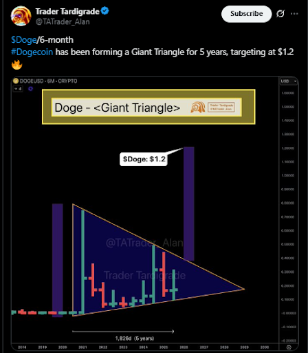 另一位署名Trader Tardigrade的分析师研究了长期图表,发现一个持续近五年的巨型三角形态。该形态既包含牛市爆发阶段,也涵盖后续漫长回调,反映出同一结构内多次牛熊周期转换。