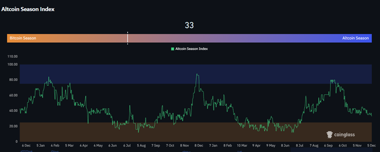 最新数据显示山寨币季节尚未正式启动,观测时山寨币季节指数仅为33点,该指数上次处于如此低位还要追溯到2025年7月第二周。