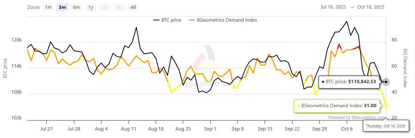 BGeometrics最新数据显示,$比特币需求出现显著下降,其需求指数已跌至31点,创数周来新低。这一下滑趋势与比特币价格跌至110,842美元左右相吻合,反映出市场兴趣与价格支撑之间的脱节正在加剧。