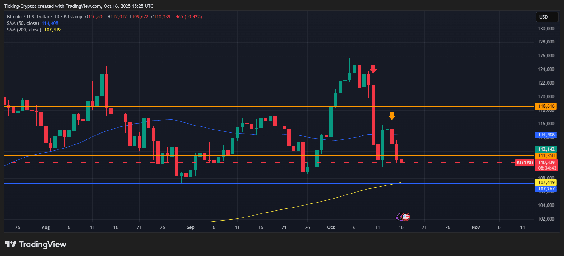 最新日线图印证了需求萎缩:$BTC现报110,339美元,勉强维持在200日均线107,419美元这一关键长期支撑位上方。而114,408美元的50日均线已构成强劲阻力,压制所有突破尝试。