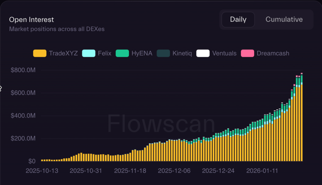 去年十月上线的HIP-3(Hyperliquid改进提案)允许开发者基于任意资产价格指数推出永续期货合约。此番上涨行情表明,推动价格走高的主要力量来自永续市场的激进建仓而非现货积累。这暗示新头寸正在入场,而HIP-3的增长也印证了平台特定需求的存在,而非单纯依赖整体市场数据。