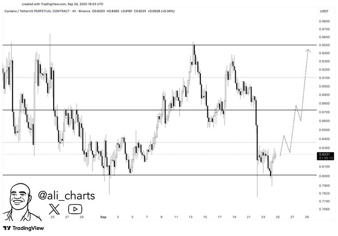 分析师Ali(@ali_charts)强调,只要ADA维持在0.80美元关口上方,反弹至0.95美元的可能性依然存在。该价位已多次吸引买盘兴趣,为潜在复苏奠定基础。但若明确跌破此需求位,可能下探0.76美元附近目标。