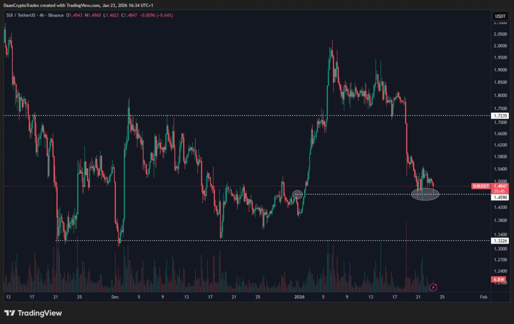 经历近期回调后,SUI目前稳守1.45美元附近支撑区域。该价位此前曾作为突破关口,现正经历回测试探。过去数月内,SUI已形成逐步抬高的低点结构,表明买盘兴趣持续存在。