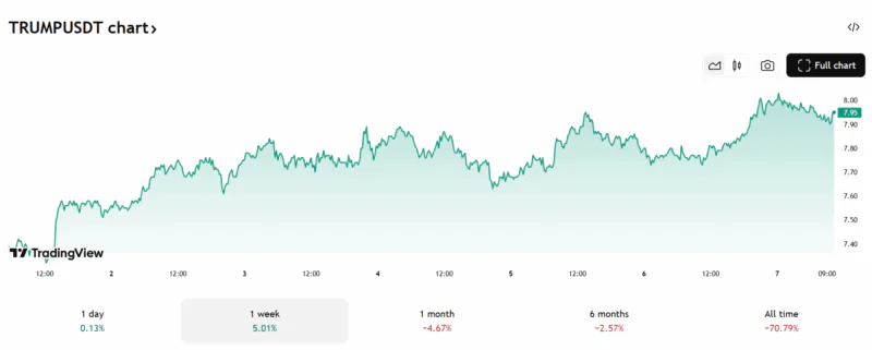 总市值15.6亿美元的$TRUMP已从网络迷因进化为凝聚6.33万持有者的政治能量符号。当前价格测试7.98美元阻力位,突破8美元后将挑战8.2-8.3美元区间。CoinMarketCap社区看涨情绪达64%,若政治风向持续有利,价格有望再创新高。