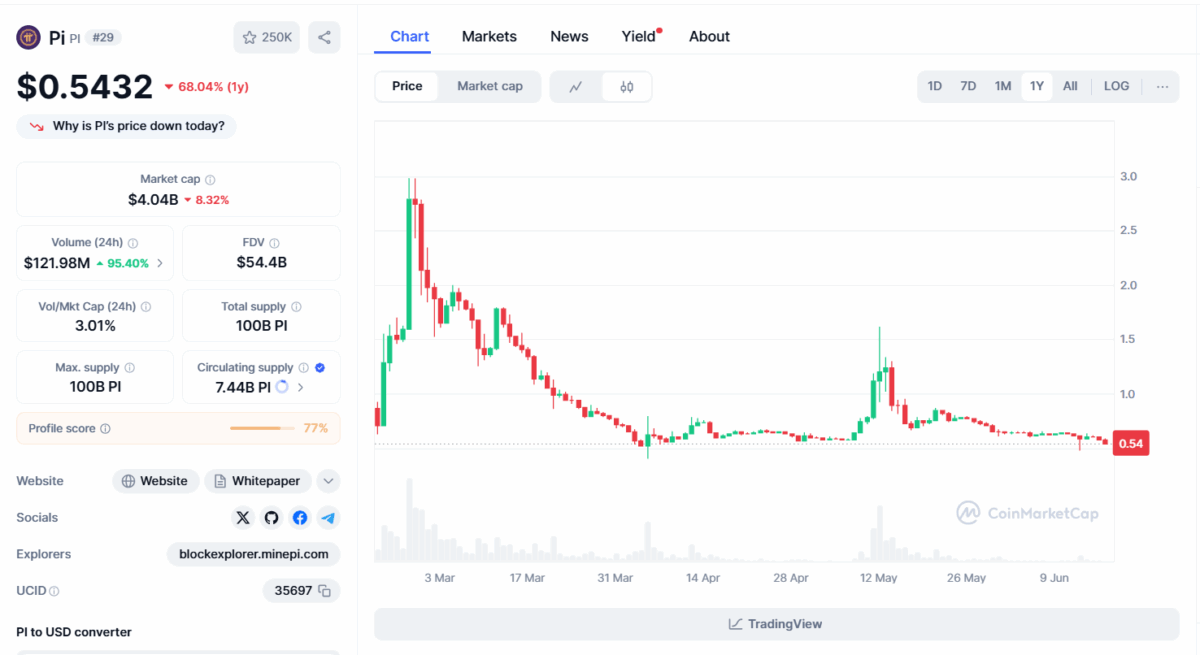 PI现报0.54美元,24小时交易量突破1亿美元。尽管40亿美元市值中仍有大量代币处于锁定状态,但750亿枚流通量相较1000亿总供应量表明,真正的投资者浪潮尚未到来。