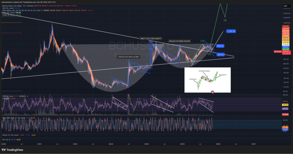 历史数据显示,这些旗形曾在关键转折点实现突破:2023年7月的杯底形态(+227%)、2024年2月的杯底形态(+221%)以及2024年11月的楔形支撑(+121%)。当前相对强弱指数(RSI)呈现下降通道/楔形形态,预示着BCH可能即将迎来突破。