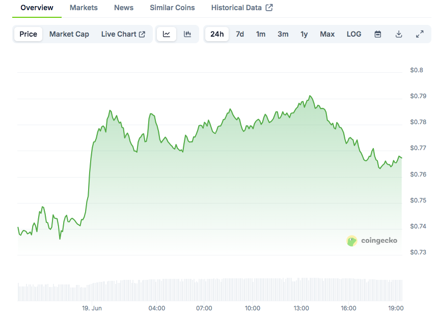 ONDO现价约0.77美元,24小时微涨3.3%。尽管周跌幅超过8%,但价格表现仍具韧性。市场观察人士认为突破1.2美元关口可能加速上涨。