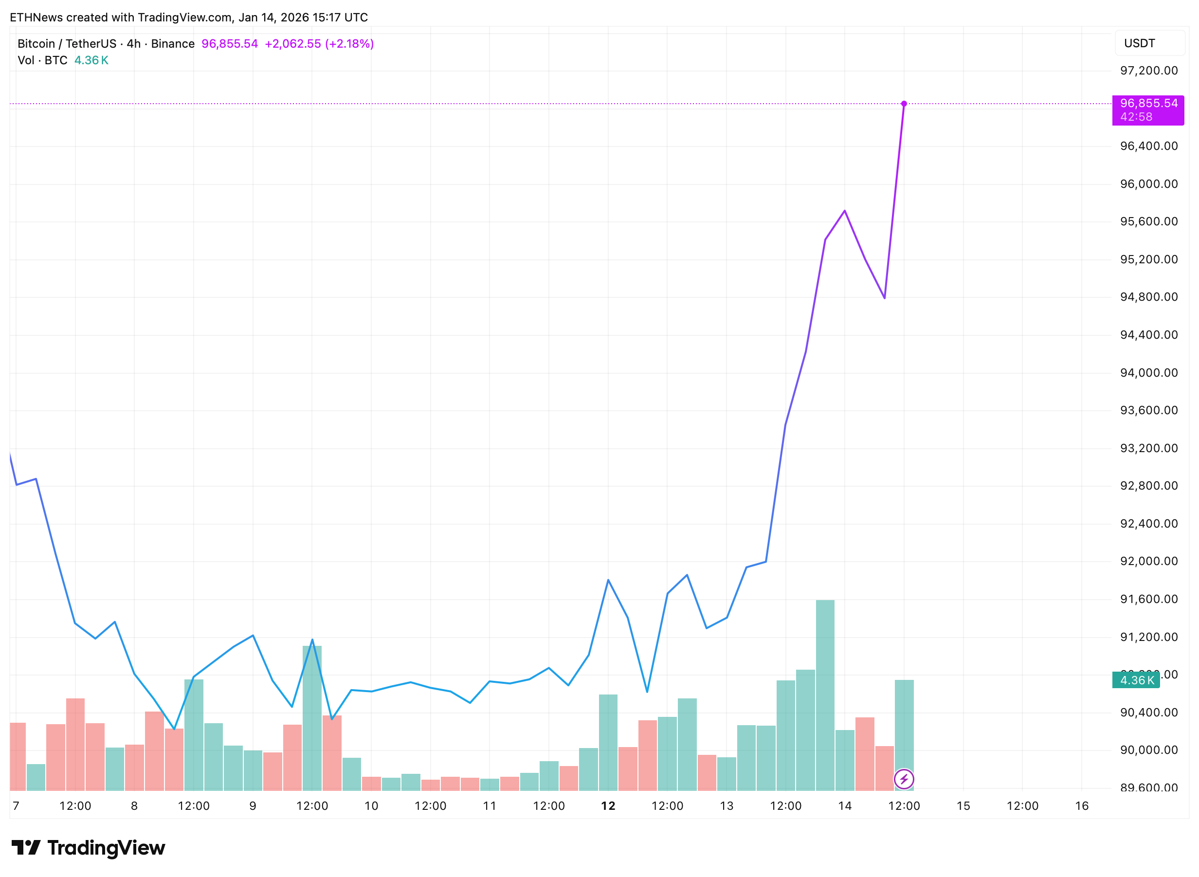 在连续数个交易日于92,000美元下方震荡后,比特币迅速加速上行,几乎未遇阻力地突破了多个中间价位。虽曾短暂回调至94,500美元区域,但买盘随即重新入场,将价格直接推升至96,800美元区间。