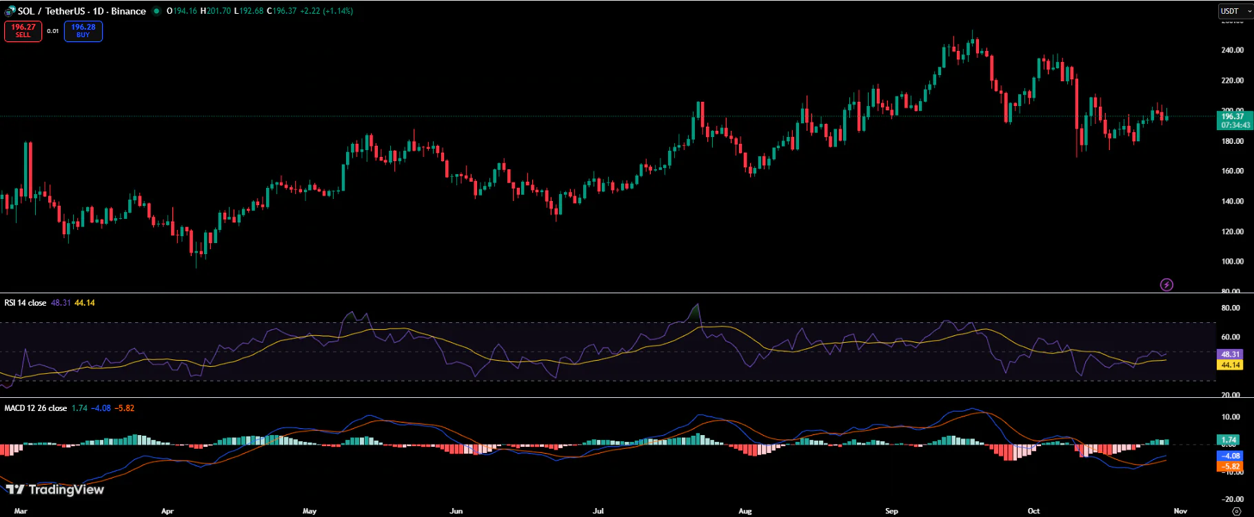尽管利好消息不断,Solana价格仍保持相对稳定,目前交易于196.3美元附近,日内微涨1.1%。技术指标显示市场可能正在积蓄上行动能。
