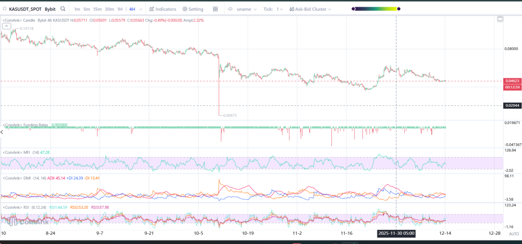 近期价格走势显示KAS在0.046美元区域附近徘徊,该位置已形成短期平衡区间。虽然多头多次在此介入,但每次上攻尝试都缺乏持续性。十一月底的反弹在0.060美元区域附近受阻,确认空头仍掌控着上方空间。