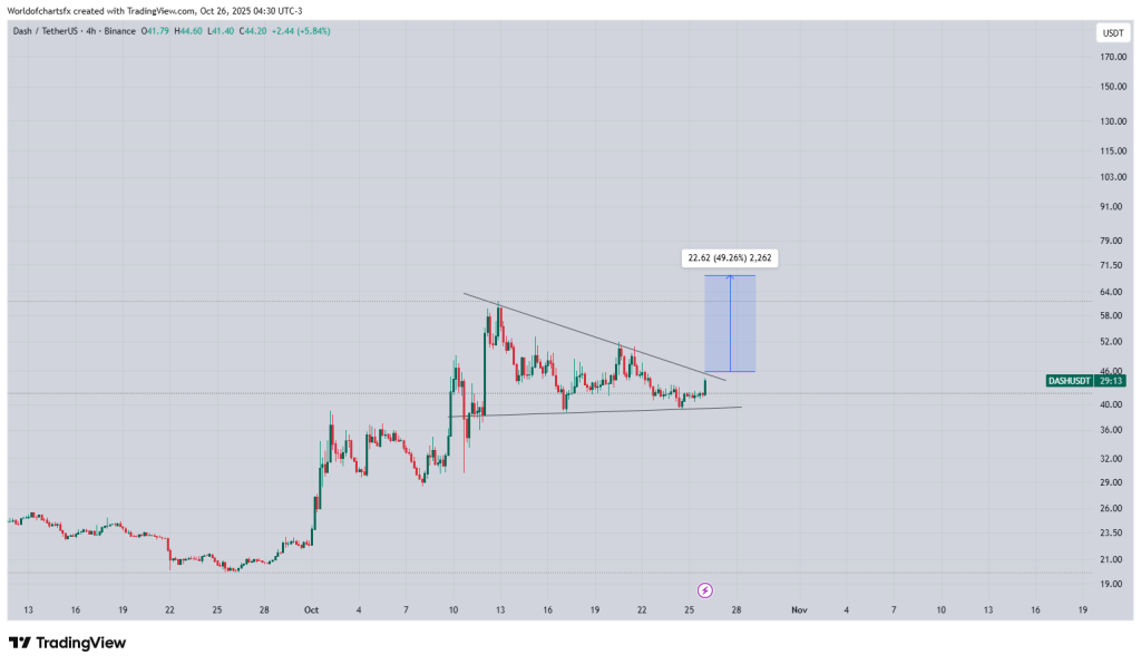 在成功跨越45美元关键位后,DASH价格现已突破上方趋势线,动能呈现持续增强态势。当此类三角形态配合显著成交量突破时,往往引发快速而强劲的上涨行情。