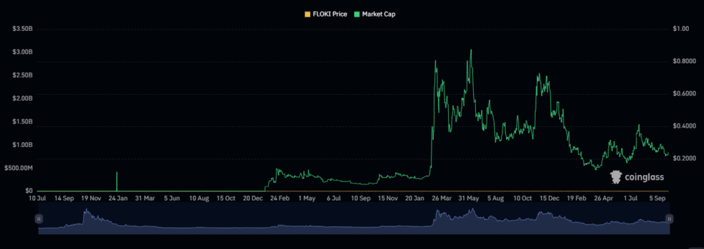 2022年初项目曾出现市值突破15亿美元的爆发式增长,这种与模因币热潮同步的上涨随后迎来修正。但FLOKI通过转向实用价值保持了市场相关性。2022年末至2023年初,随着市值再度逼近20亿美元,市场兴趣重新燃起,价格波动呈现社区驱动型资产特有的高波动性。