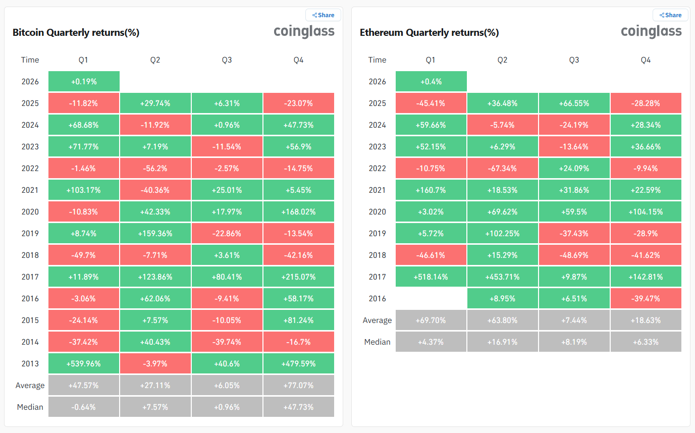 比特币和以太坊以大幅亏损结束了2025年第四季度。Coinglass数据显示,这两种资产均经历了有记录以来最糟糕的第四季度之一。这一结果令许多投资者感到震惊,因为第四季度通常是加密货币市场表现最强的时期。