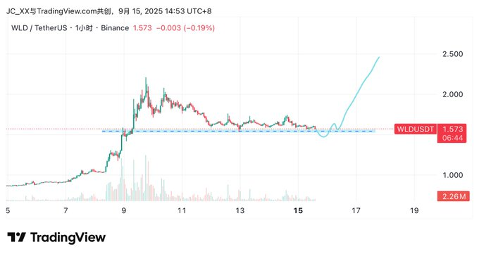 分析师MindX(@Mind_XXXXX)将当前WLD/USDT走势描述为阶段性序列,指出初期暴涨形成尖锐峰值后,价格在蓝色支撑位上方震荡。据该观点,1.55-1.60美元区间仍是核心观察位置。