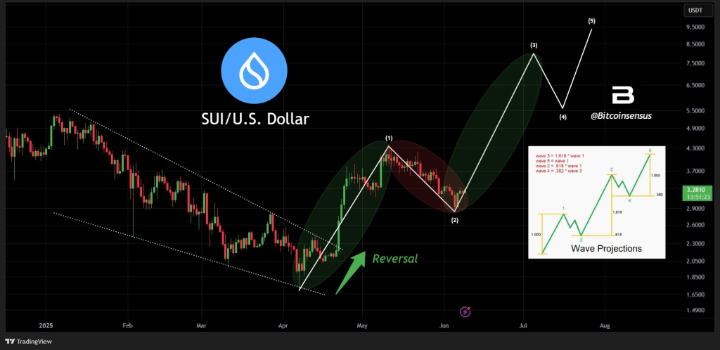 过去四天,SUI代币价格飙升18%,多位分析师认为这仅是上涨序幕。图表显示更大规模的行情可能即将启动。技术分析师Bitcoinsensus运用艾略特波浪理论进行的分析尤为引人注目——他认为SUI很可能已完成第(1)浪运行,当前正处于第(2)浪调整尾声。