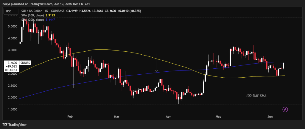 分析师同时指出,下降楔形形态的突破证实了SUI日线级别的趋势反转,进一步强化了看涨依据。
