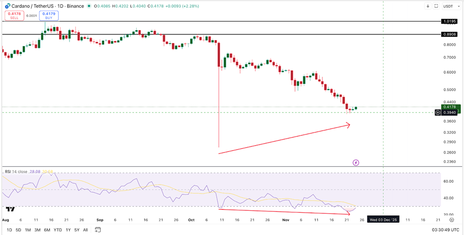 10月10日至11月22日期间,ADA价格形成更高的低点,而RSI却形成更低的低点。