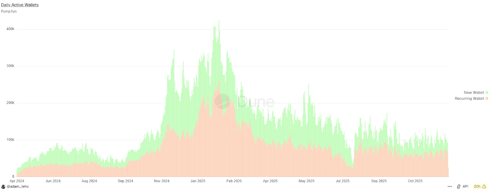 Solana的增长与投机周期紧密绑定。代币发行平台Pump.fun的钱包活动数据清晰展示了迷因币在Solana上的崛起轨迹。