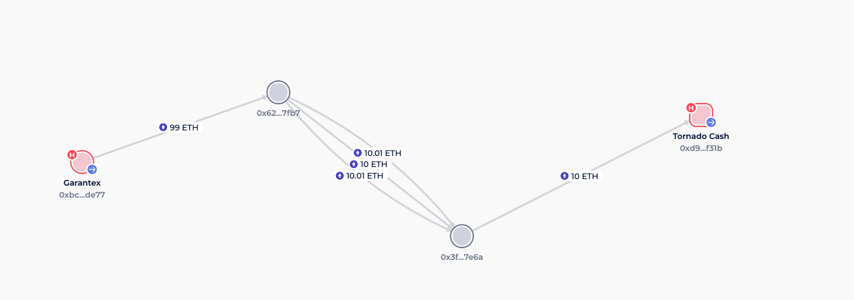 具体而言,Garantex热钱包先将99枚ETH(约合26.1万美元)转至中间地址。随后这些ETH被拆分为三笔独立交易,转入另一个中间钱包(0x3f...7e6a)。这种分层操作是典型的洗钱技术,旨在模糊资金轨迹。