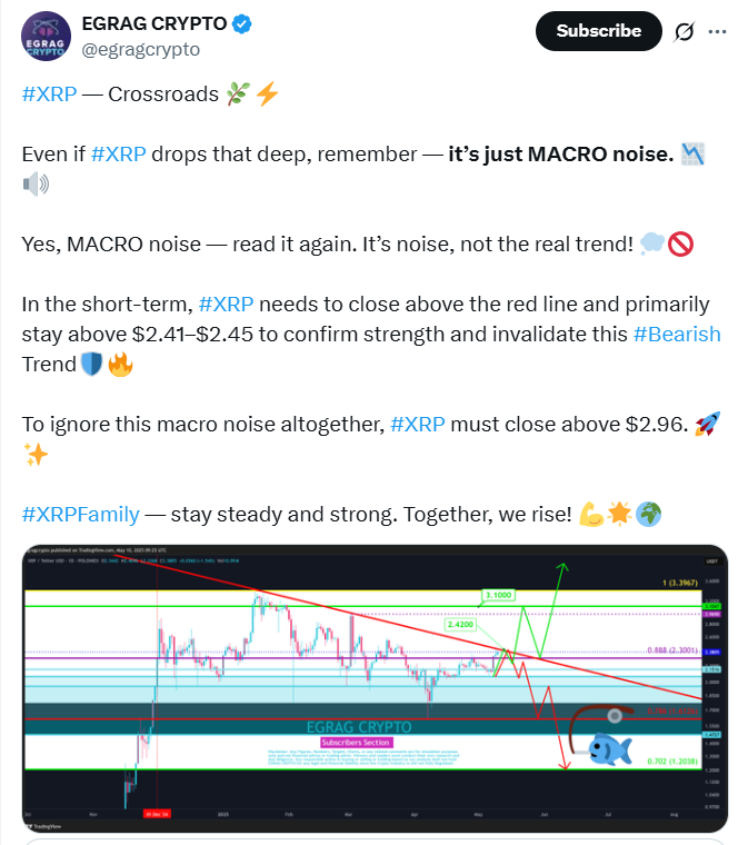 他强调,这种价格下跌并不反映该代币的长期趋势。分析师坚持认为,这只是对大局的干扰,可能导致一些人恐慌并抛售。EGRAG CRYPTO向XRP持有者传达的信息是,如果XRP价格下跌,不要恐慌。他为市场参与者提供了关键的XRP价格水平以供关注。根据他的说法,XRP需要保持在2.41美元和2.45美元以上并维持这一水平,才能表明其已突破看跌趋势。