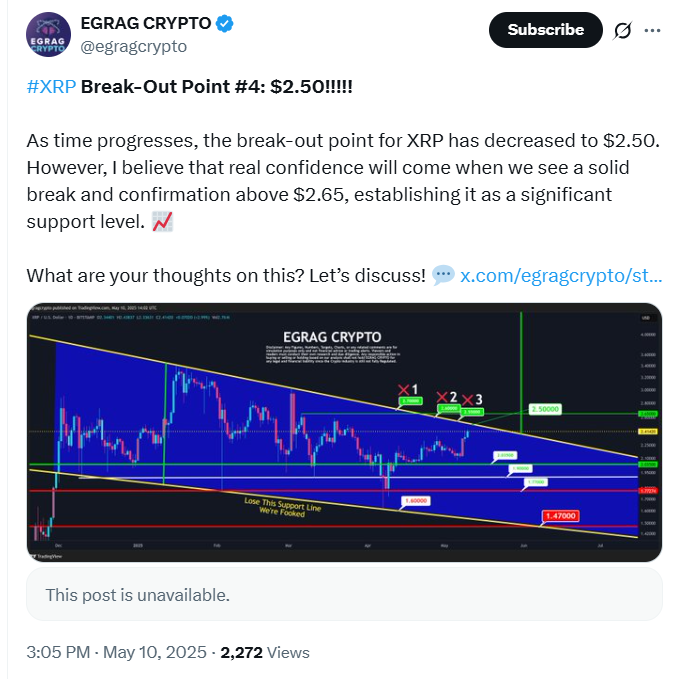 EGRAG CRYPTO将XRP的新突破点定在2.50美元。他解释说,由于市场状况和可能的长期盘整,该资产的看涨触发点已降至2.50美元。然而,他认为只有当XRP升至2.65美元时,市场参与者才会对该资产充满信心。