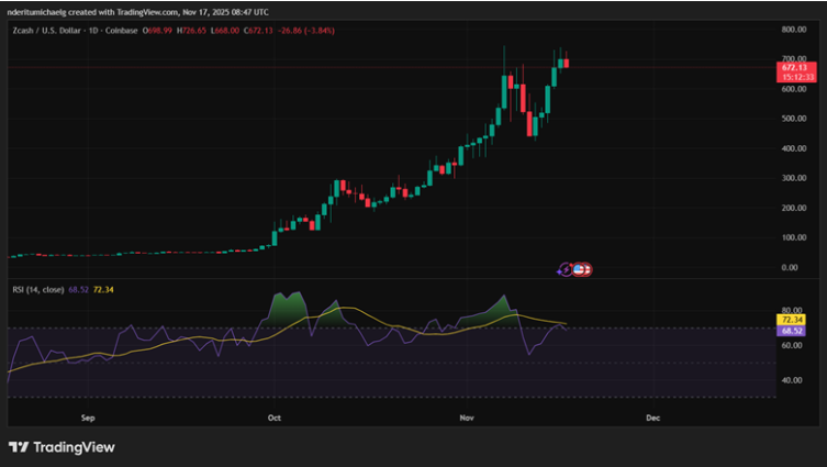 在连续五日收阳后,Zcash价格于周日最高触及740美元,较周低点上涨13%,印证了市场需求的强劲。截至发稿时,价格小幅回落至674美元,表明看涨动能有所减弱。