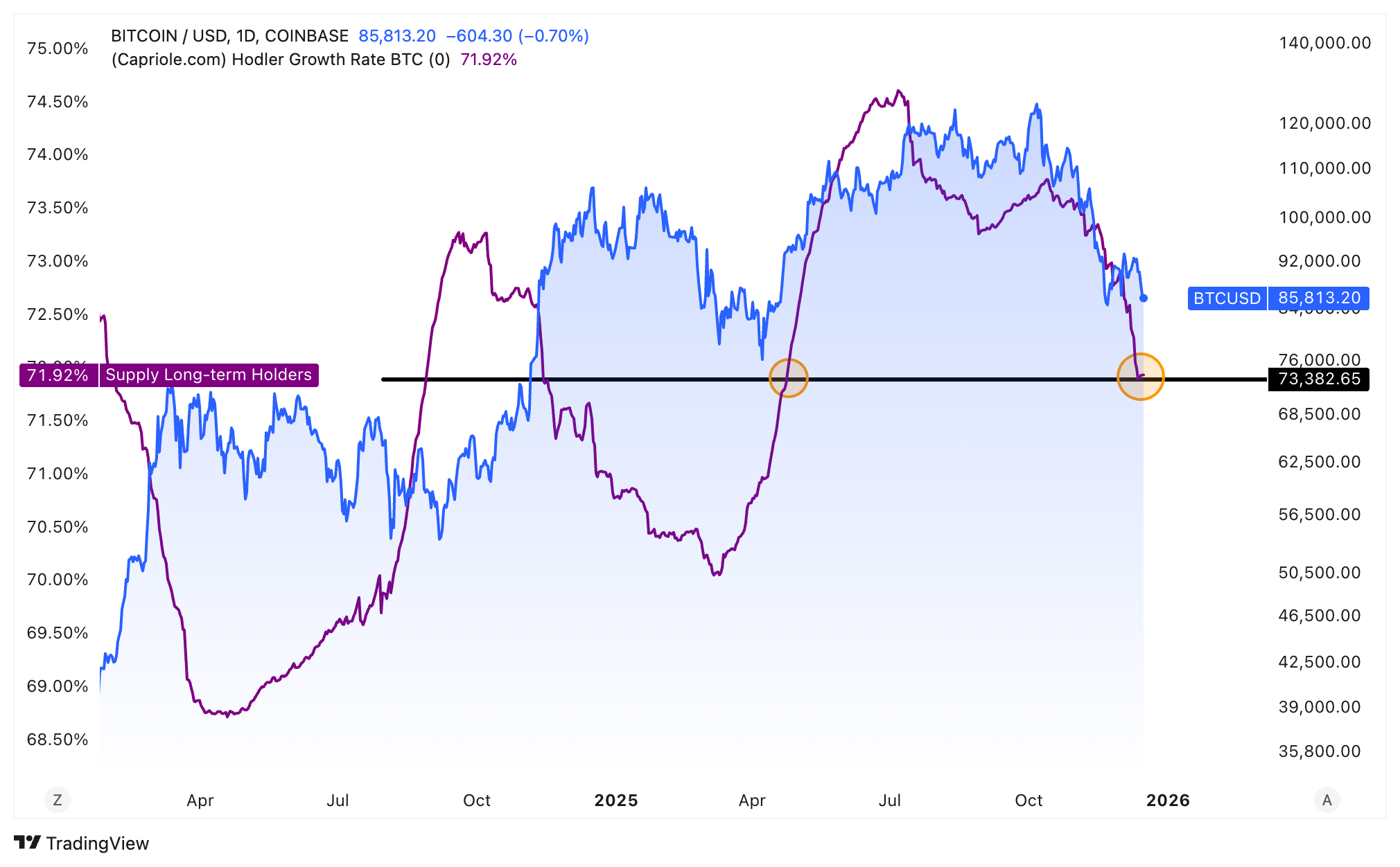比特币长期持有者持仓占比降至72%,创四月以来新低;若关键支撑位失守,BTC价格可能面临跌至68,500美元的深度回调风险。
