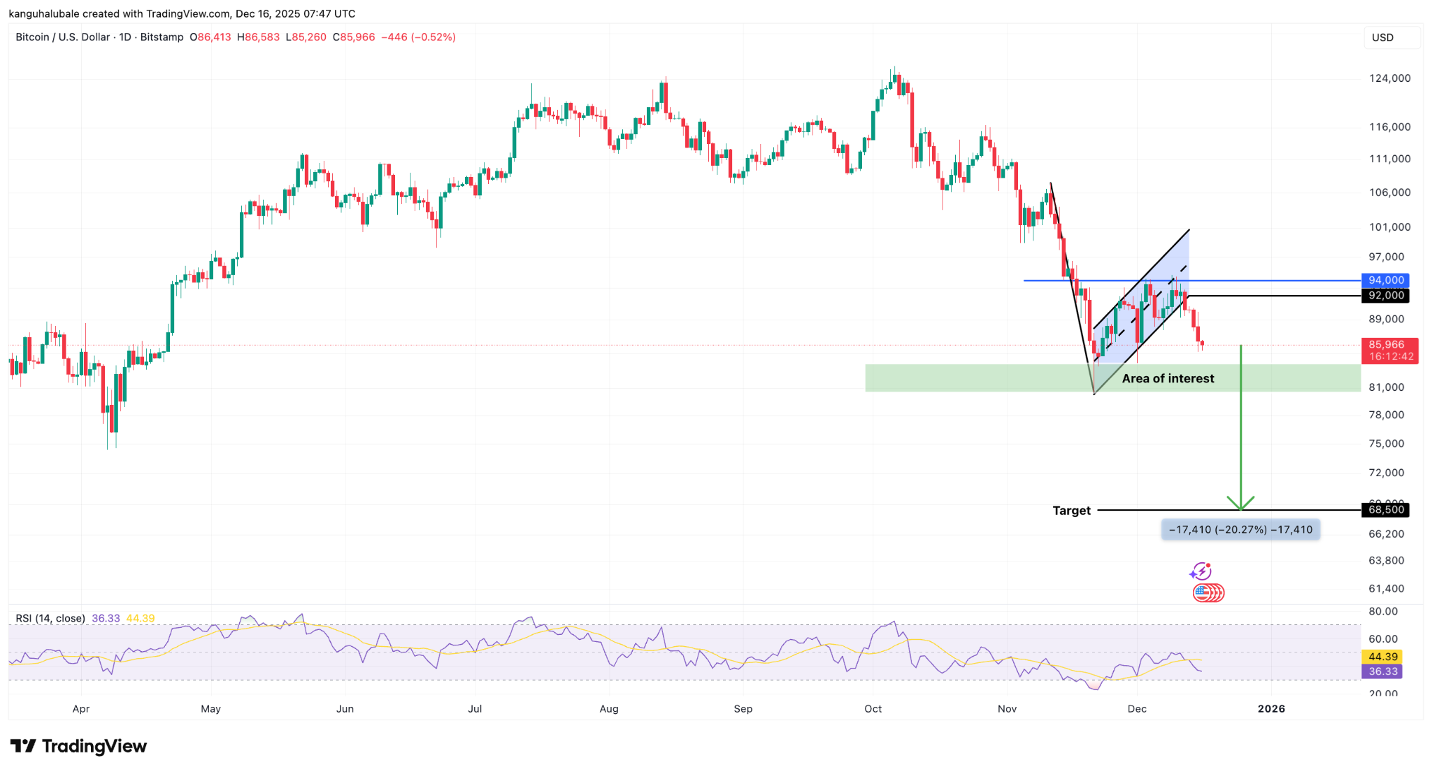 图表显示,BTC/USD交易对在上周五跌破92,000美元旗形下轨后确认熊旗形态。当前关键观察区间位于12月1日形成的83,800美元局部低点与11月21日创下的80,500美元多月低点之间。若该支撑区域失守,价格可能依循旗形度量目标下探200周均线所在的68,500美元,较现价跌幅将达20%。