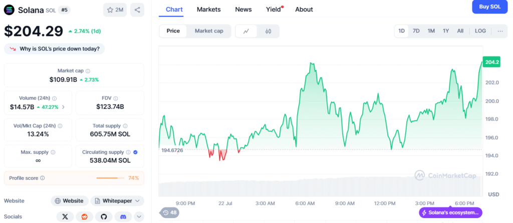 CoinMarketCap最新数据显示,$SOL现报204.29美元,24小时交易量145.7亿美元,市值1097.5亿美元,过去24小时上涨2.74%,为看涨预期提供支撑。