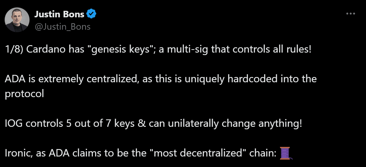 最近,在2024年5月,欧洲加密货币基金Cyber Capital的创始人和首席信息官发表了一系列激烈的推文,批评Cardano拥有"创世密钥",这是一个可以单方面改变整个网络规则的多重签名钱包。