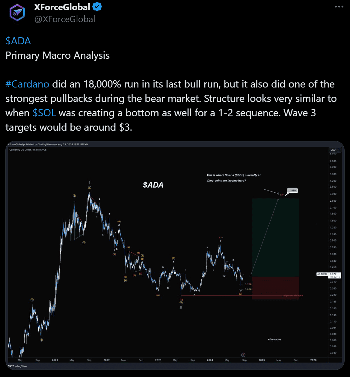 如果来自加密货币领域投资分析师的Cardano价格预测有任何迹象,那么其原生代币可能会迎来一轮疯狂的牛市。受欢迎的艾略特波浪理论交易分析师XForceGlobal最近发布了一个3美元的ADA价格目标,预计在2025年中期实现。该分析师写道:"Cardano在上一次牛市中上涨了18,000%。"