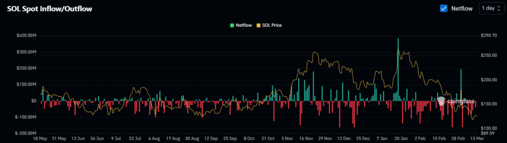 自1月初以来,现货流出一直占据主导地位,但最近也出现了下降。然而,现货流入并未显示出明显的转向,这证实了市场对SOL的看涨前景仍存在不确定性。