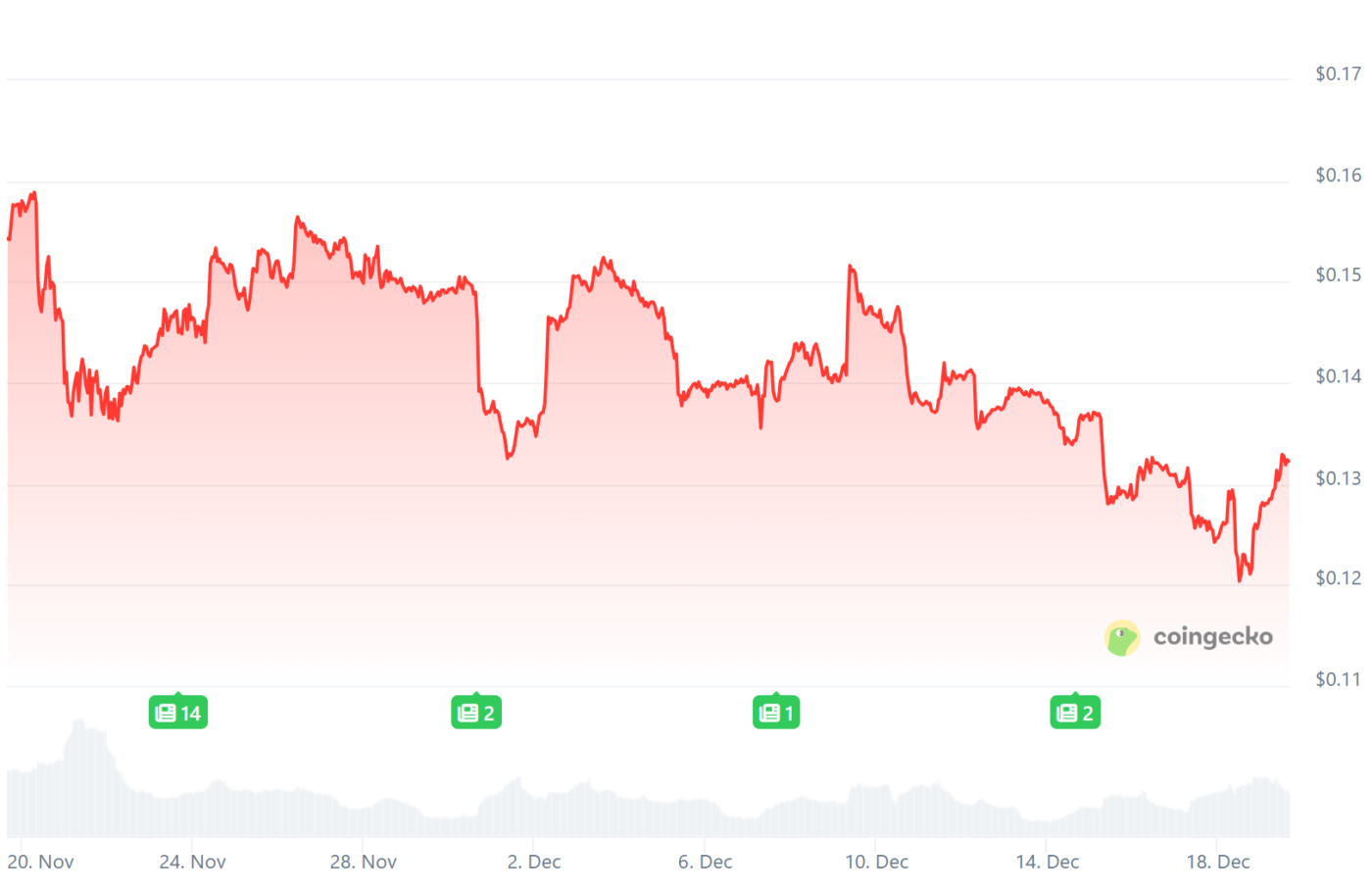 十二月中旬,随着迷因币动能降温,DOGE走势落后于加密市场整体行情。根据市场数据,12月11日至18日期间,DOGE在0.13至0.14美元区间震荡,资金则向比特币轮动。
