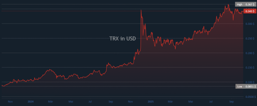 TRX目前正在0.343美元附近进行盘整,形成坚实的支撑基础,这通常是新一轮看涨势能的先兆。交易量持续下降表明筹码正在积聚,暗示大户正在为潜在上涨行情布局。随着低点逐步抬高和技术面持续改善,若2025年底买盘压力增强,TRX有望突破0.37美元关口。