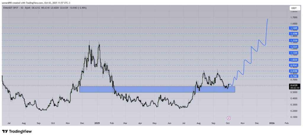 2025年夏季期间,ENA从1月1.30美元高位回落后经历了长期盘整。在0.55至0.70美元区间,买家持续介入——该区域正是今年早前大规模上涨的起跳平台,现已成为主要支撑位。