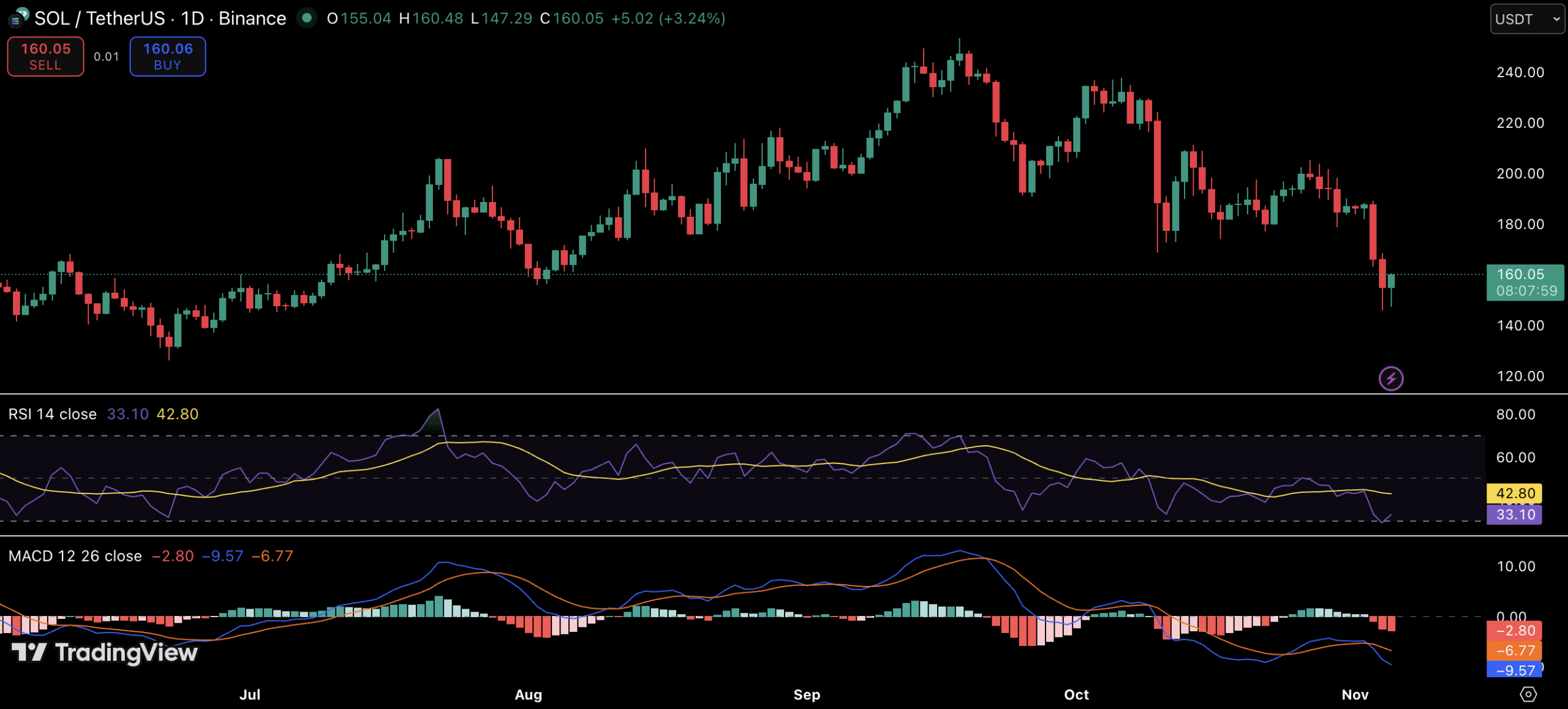 技术指标显示分化:RSI现报33接近超卖区,而MACD仍释放看跌信号。交易者正密切关注SOL能否重新站上170美元支撑位,这可能预示短期趋势转变。