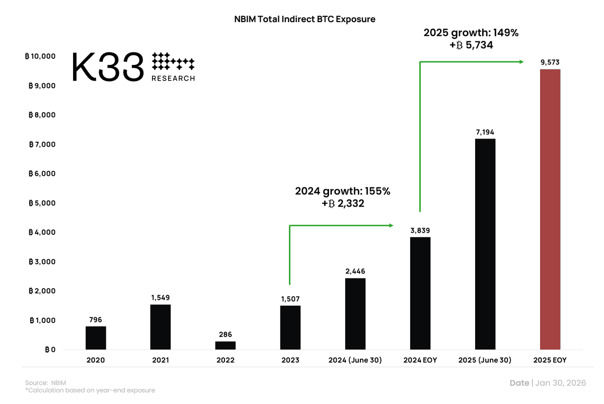 挪威政府全球养老基金已显著增加其对比特币的间接风险敞口,截至2025年底持有相当于9,573枚比特币的资产,估值约合8.37亿美元。这一数字较上年同比增长149%,尽管该基金并未获得投资数字资产的明确授权。其敞口增长并非来自战略性的比特币配置,而是源于该基金庞大且多元化的股票投资组合,以及其持仓企业中资产负债表持有比特币的规模持续扩大。
