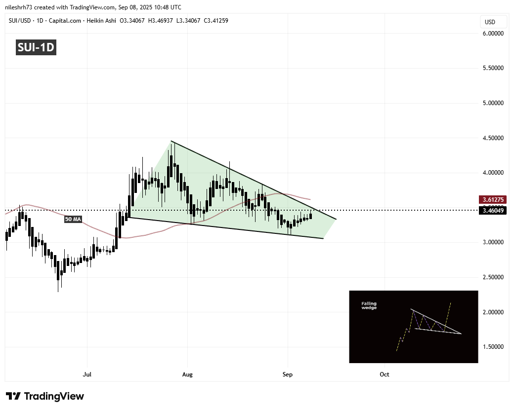 若SUI能强势突破楔形阻力并站稳50日均线(3.61美元),将构成重要看涨确认。根据楔形形态的量度目标,后续技术位上看4.99美元。反之若突破失败,代币可能再次测试支撑趋势线——该水平对维持看涨结构至关重要。
