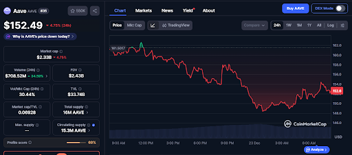 最新数据显示,AAVE现报152.49美元,24小时跌幅达4.75%。全日价格持续下行,短暂反弹未能站稳154美元上方。图表显示其在触及161美元附近高点后呈现稳步下跌趋势。