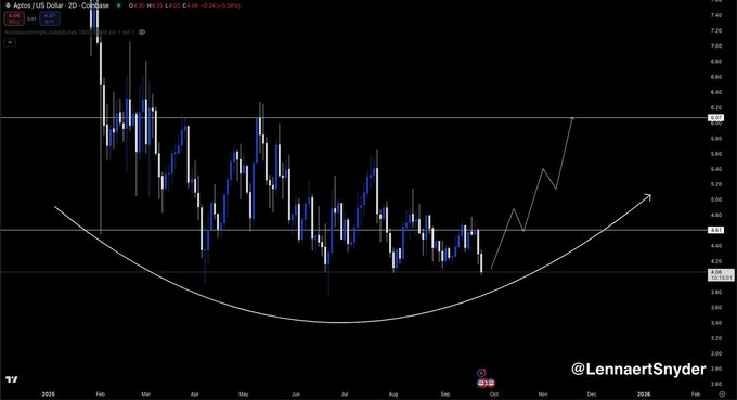 采用Lennaert Snyder的分析风格,APT/USD图表显示出筑底过程。价格走势呈现圆弧底形态,其特征是逐步积累和波动性降低。这种结构表明动量正在缓慢而稳定地积聚。
